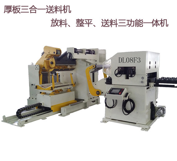 三合一送料器采用三位一體式結(jié)構(gòu),由自動材料架(開卷機)、自動材料矯平機、數(shù)控送料機、剪刀架等部分組成,可實現(xiàn)由卷料開卷、矯正整平、精確送料、剪切片料,