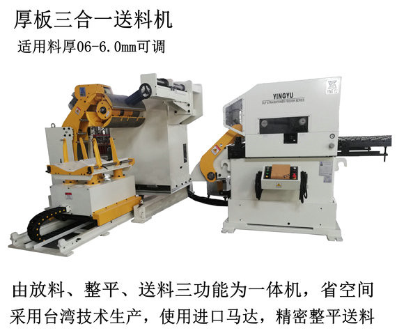 2、三合一送料機采用電腦NC控制系統(tǒng),更具人性化的設(shè)計.適合各種金屬片之送料及矯正;適合0.3-6.0厚之廣泛材料,針對節(jié)省空間及容易操作而設(shè)計。